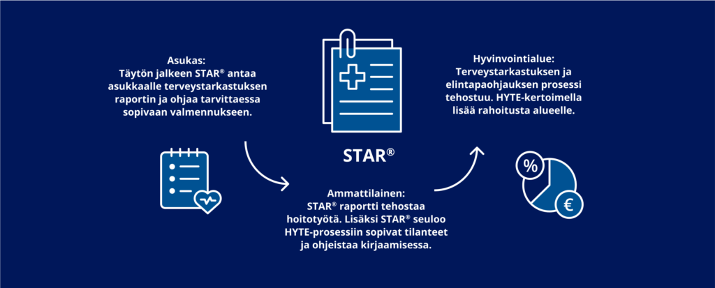 Ennakoiva STAR-terveystarkastus varmistaa, että terveiden potilaiden ei tarvitse turhaan saapua vastaanotolle. Se myös takaa, että vastaanotolle saapuvat potilaat ovat jo ennalta tietoisempia tilanteestaan – ja myös ammattilaisilla on heidän tarpeistaan selkeä käsitys STARin kautta. Näin itse vastaanottotapahtuma on mahdollisimman tehokas.